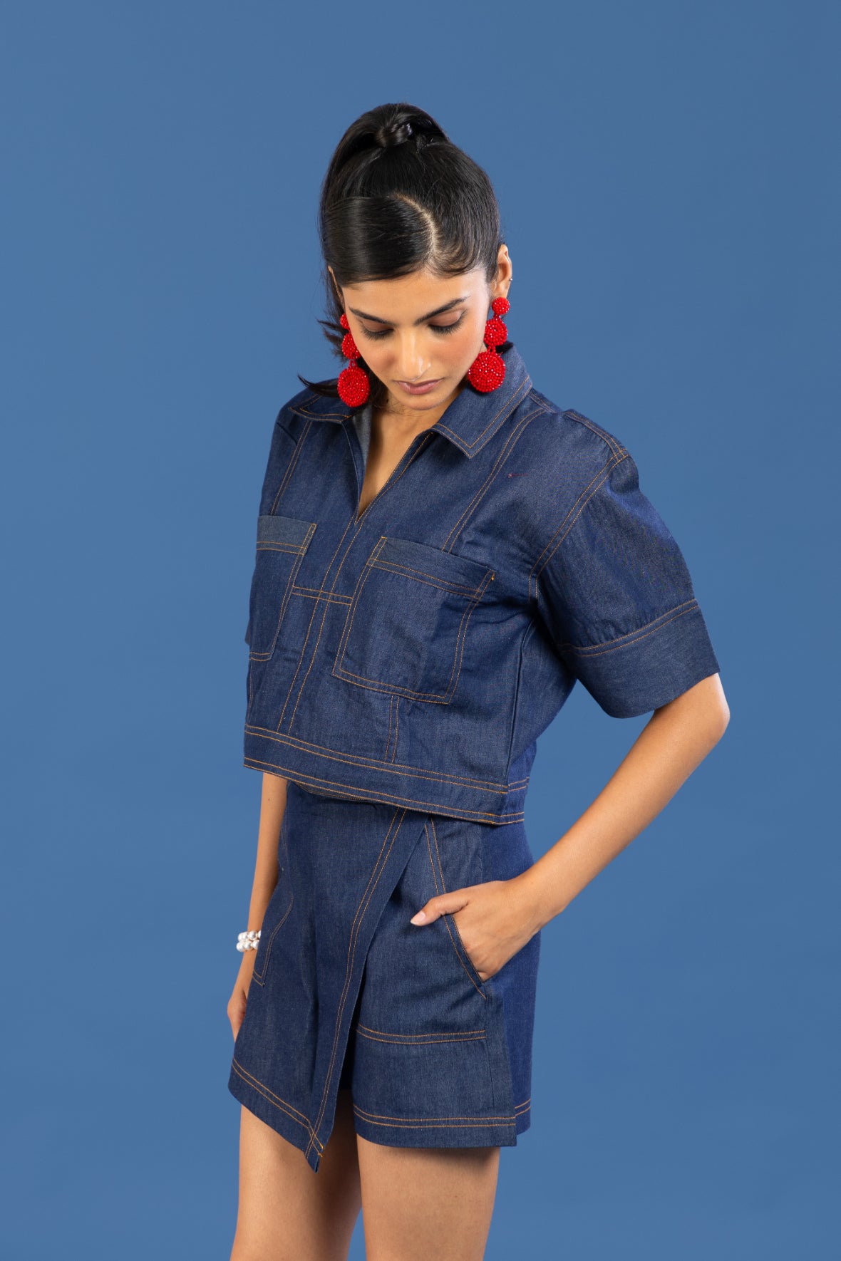 The Circuit Wrap Skort brings the best of both worlds—combining the ease of shorts with the tailored look of a skirt. Crafted in structured denim with angular seam detailing and a faux wrap front, this piece is perfect for chic movement from day to night.