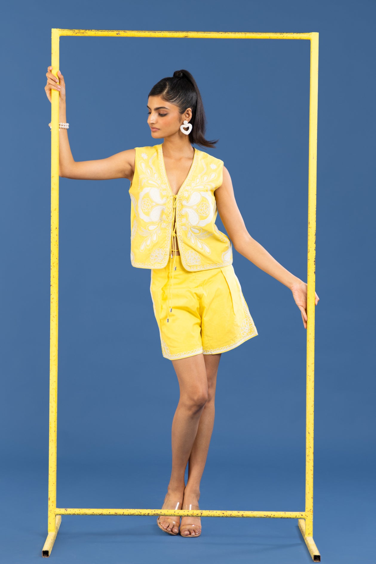 A sleeveless yellow top featuring a deep V-neckline and adjustable tie-front closure. The front is adorned with delicate white embroidery in a floral and vine motif, offering a breezy yet elegant look. Ideal for warm-weather layering or as a statement on its own.