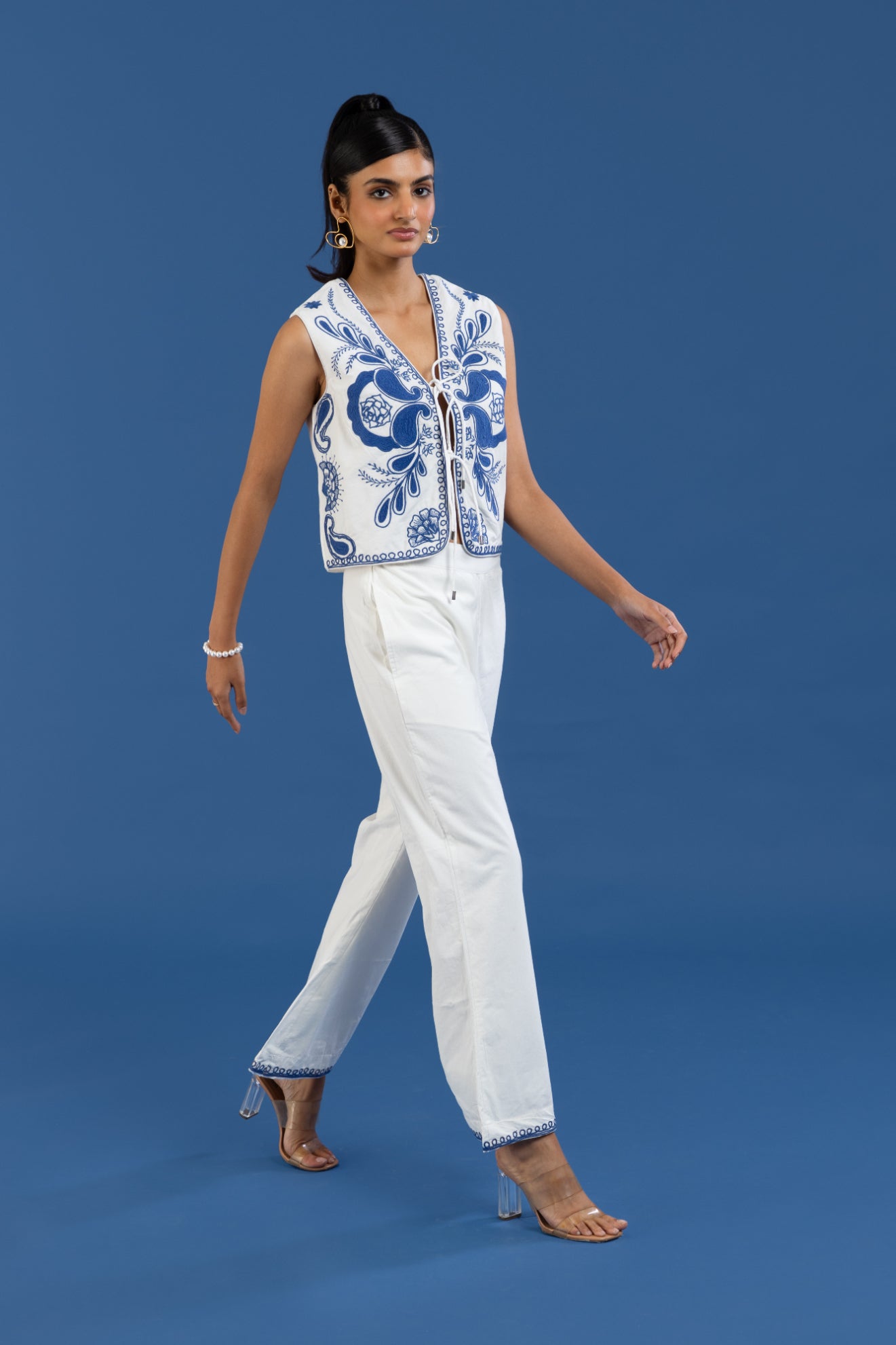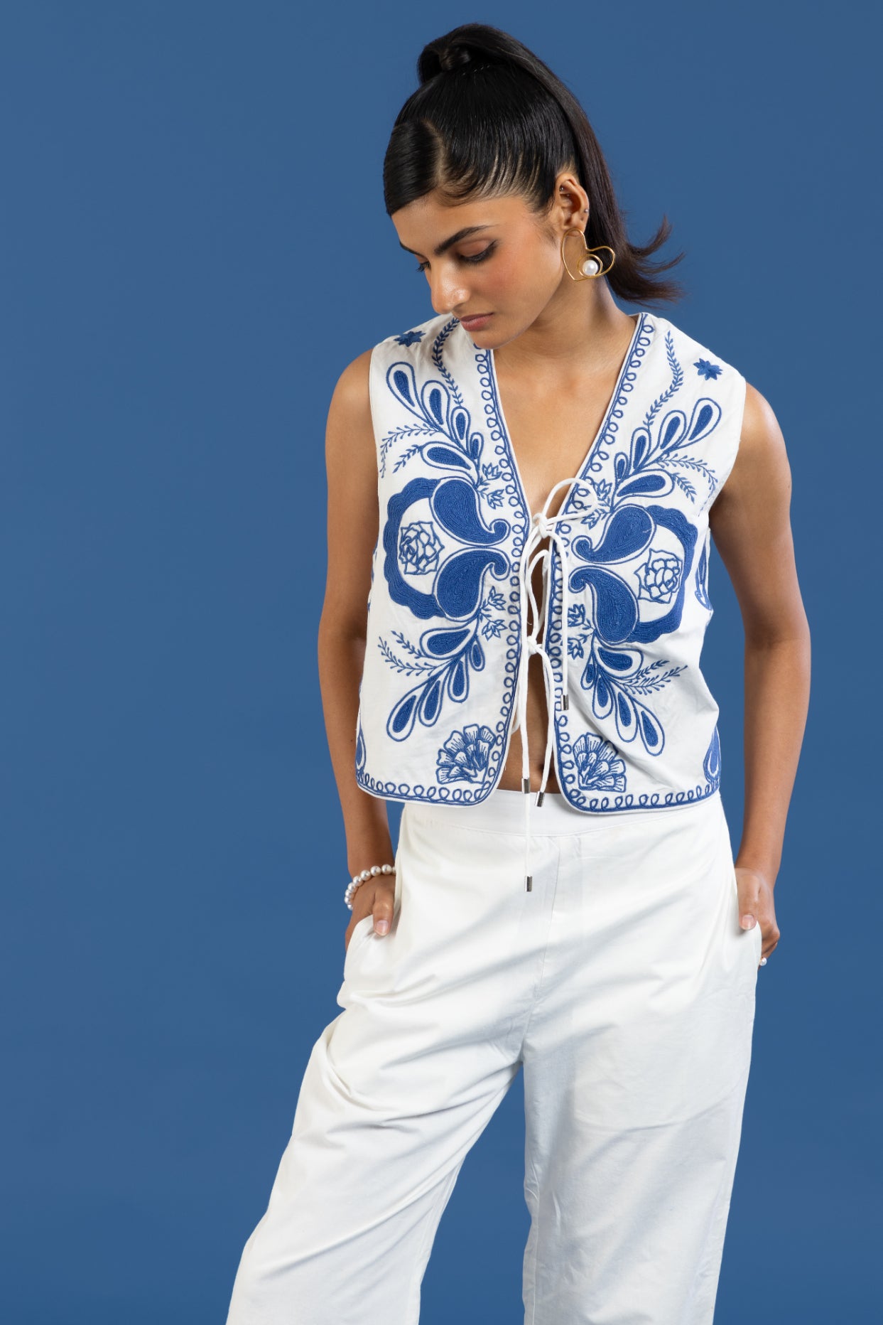 The Indigo Echo Vest is a sleeveless cotton top featuring bold hand-drawn-style embroidery in deep indigo tones. With a relaxed silhouette and a front tie-up closure, it brings artisanal charm to everyday dressing. Wear it solo for a statement look or layer it over a shirt or dress for added flair.
