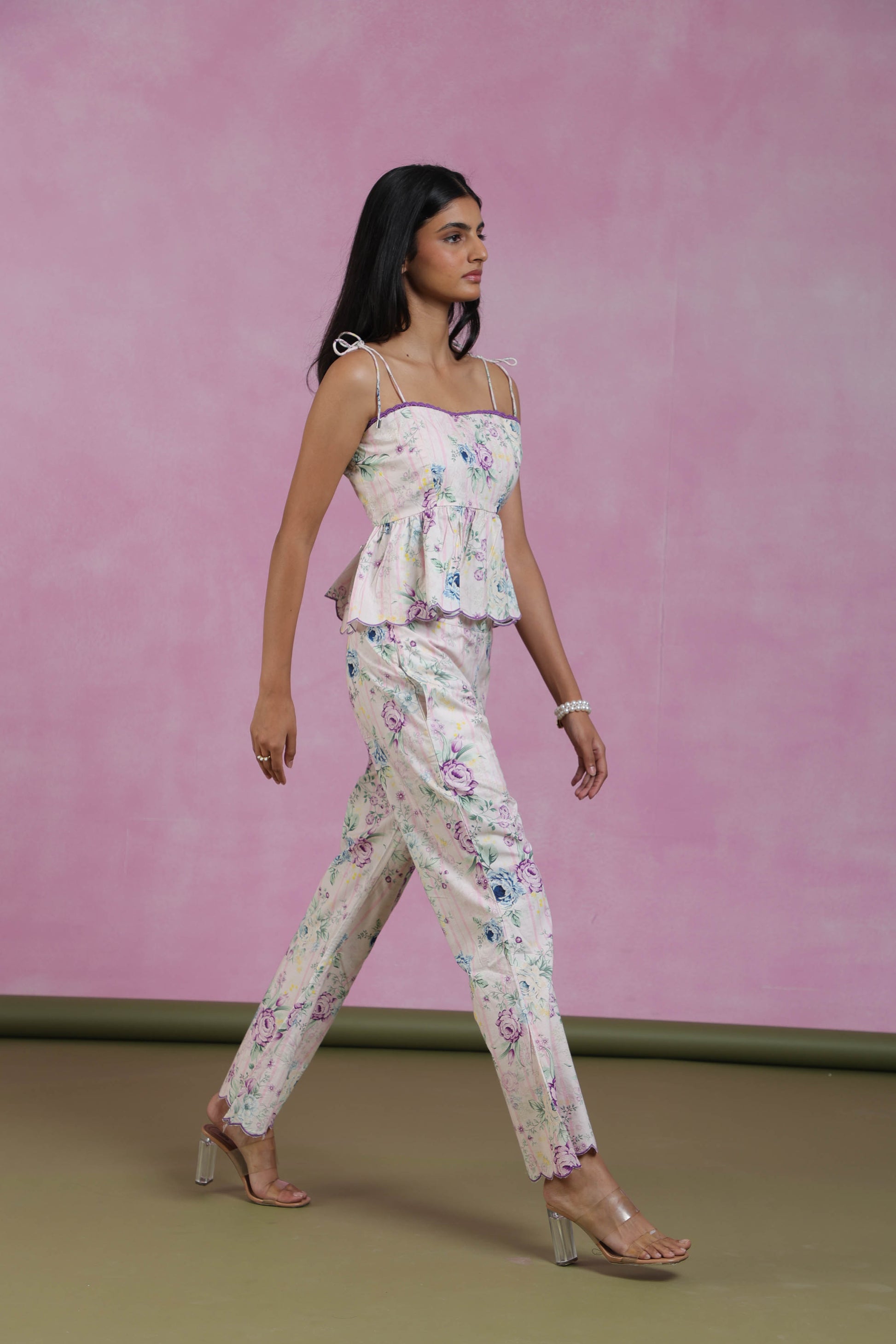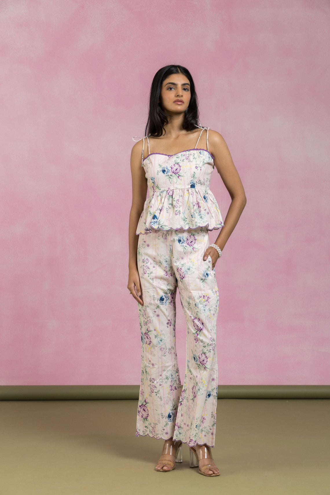 Flirty, feminine, and full of charm — the Amélie Peplum Co-ord Set is your go-to ensemble for easy elegance. Made from soft pastel floral fabric with subtle lilac piping and scalloped hems, the set features a delicate peplum top with adjustable tie-up straps and a sweetheart neckline that adds a romantic touch. Paired with wide-leg trousers that mirror the same floral print and scalloped finish, this set blends comfort and style effortlessly.